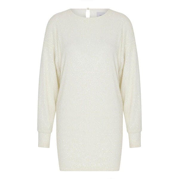 Brena Dress crafted from white sequin for a loose fit upper body, round neck, and dropped shoulders with long sleeves which counterbalance the keyhole slit, then finished with corresponding soft jersey lining.