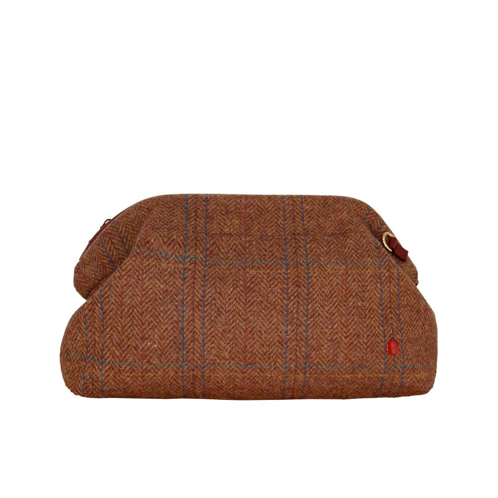 Clutch features a warm brown tweed front with a subtle plaid pattern, paired with a contrasting back in deep burgundy rescued leather. Designed for versatility, it includes a leather cord strap that allows it to be worn or carried comfortably. The combination of textures and tones makes it an ideal accessory for day-to-night use, offering both style and functionality in a compact form.