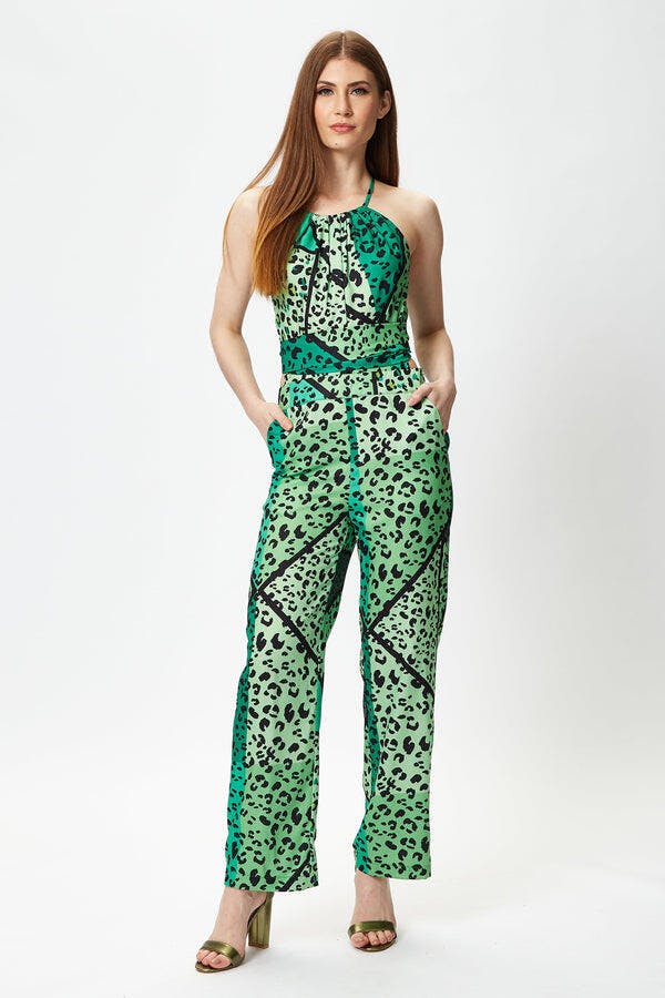 Women's Green Animal Print Jumpsuit with Tie Waist, Zip Back, Straight Fit - Made by Liquorish