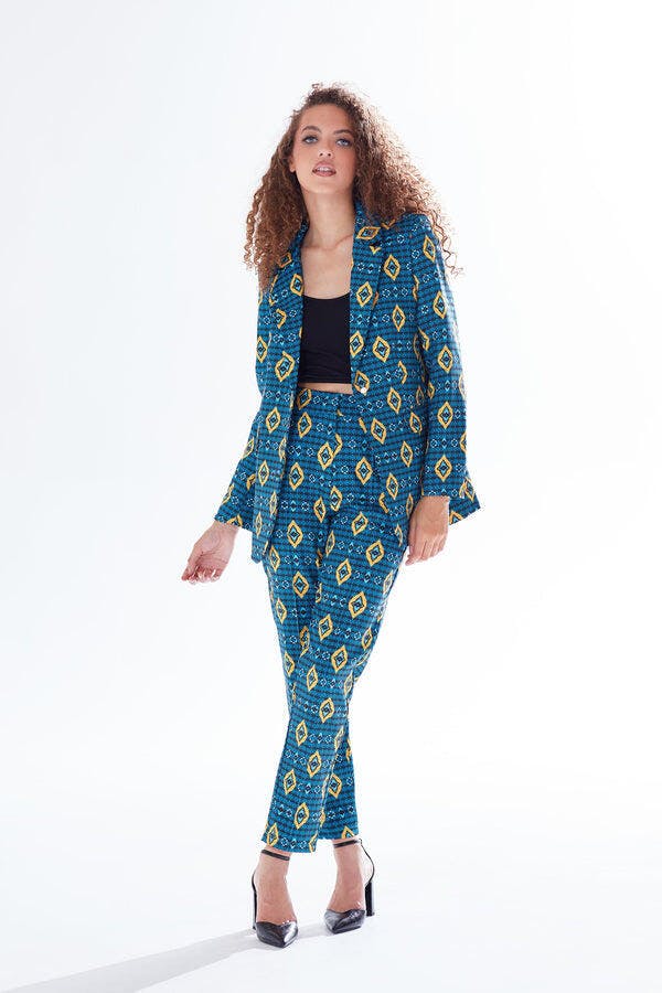- Distinctive African Print: The blazer showcases a unique geometric pattern in vibrant colors, ensuring you stand out wherever you go.