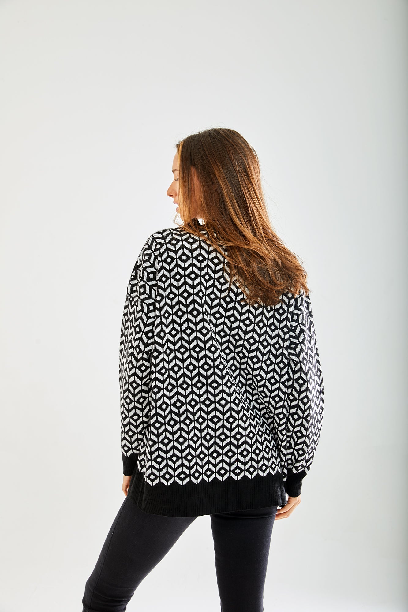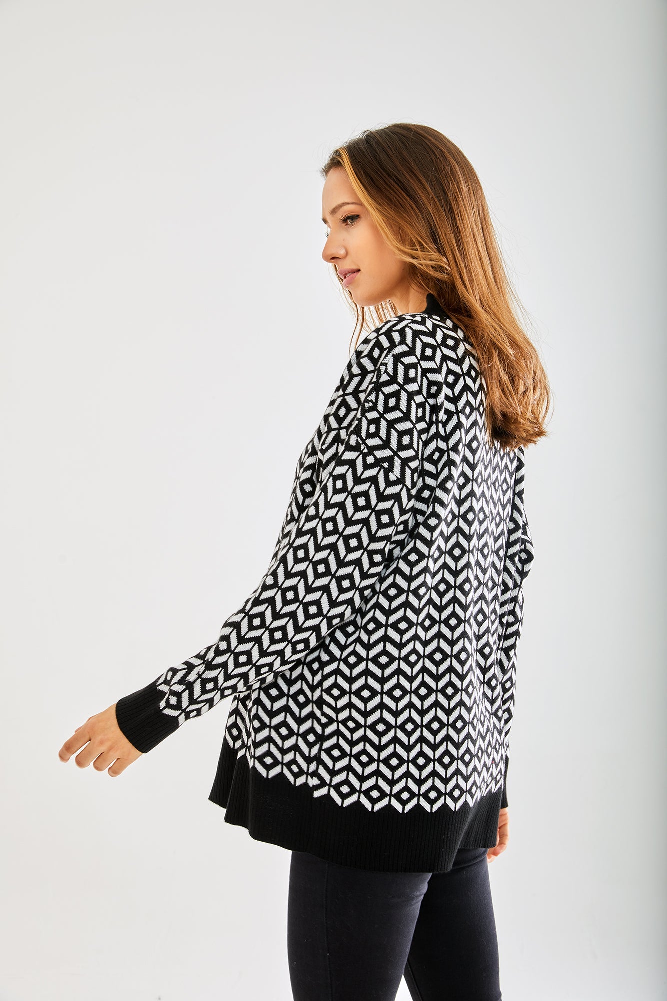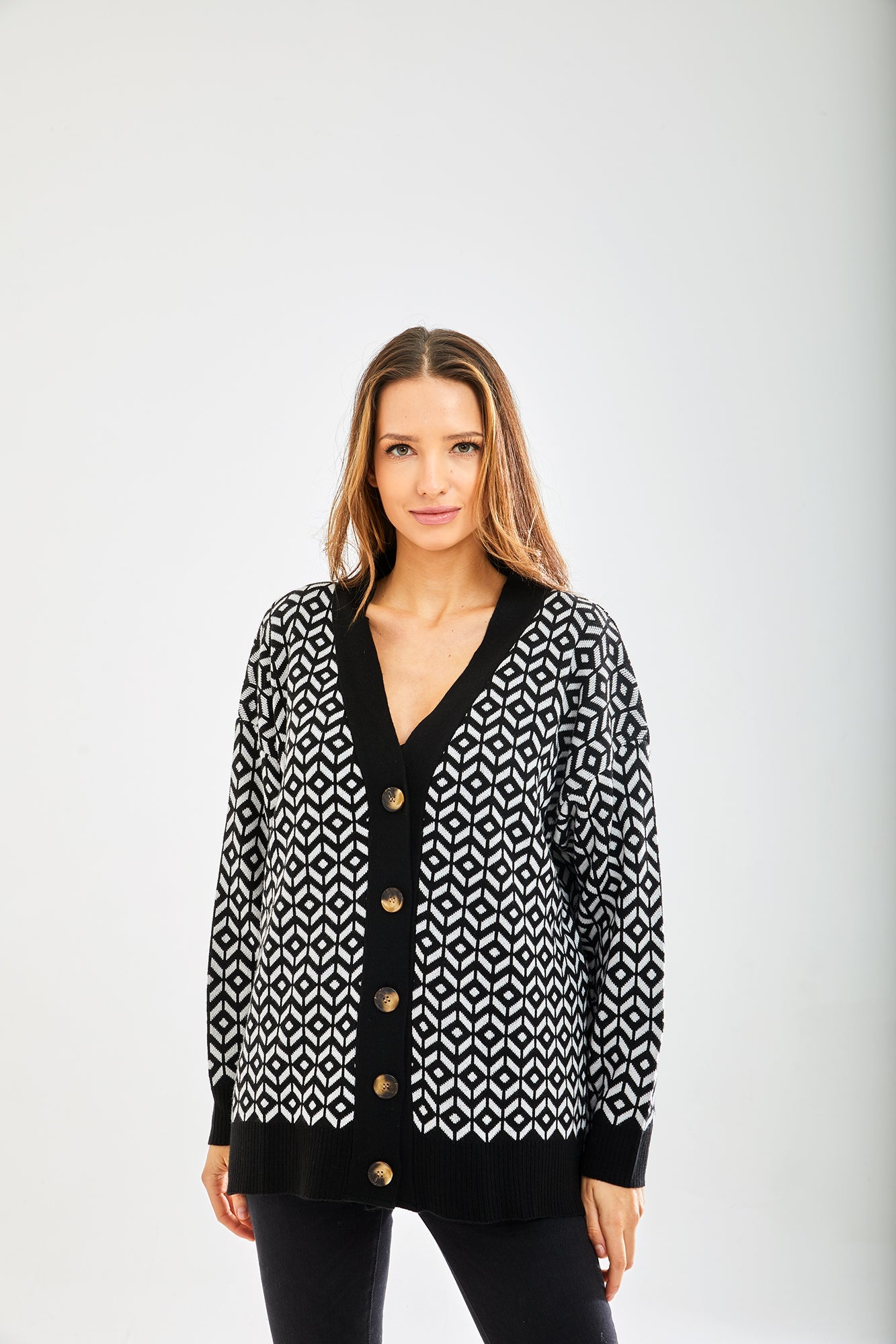 Women's Cardigan in Black and White with Long Sleeves, Unique Geometric Pattern, Stylish Fit - Liquorish