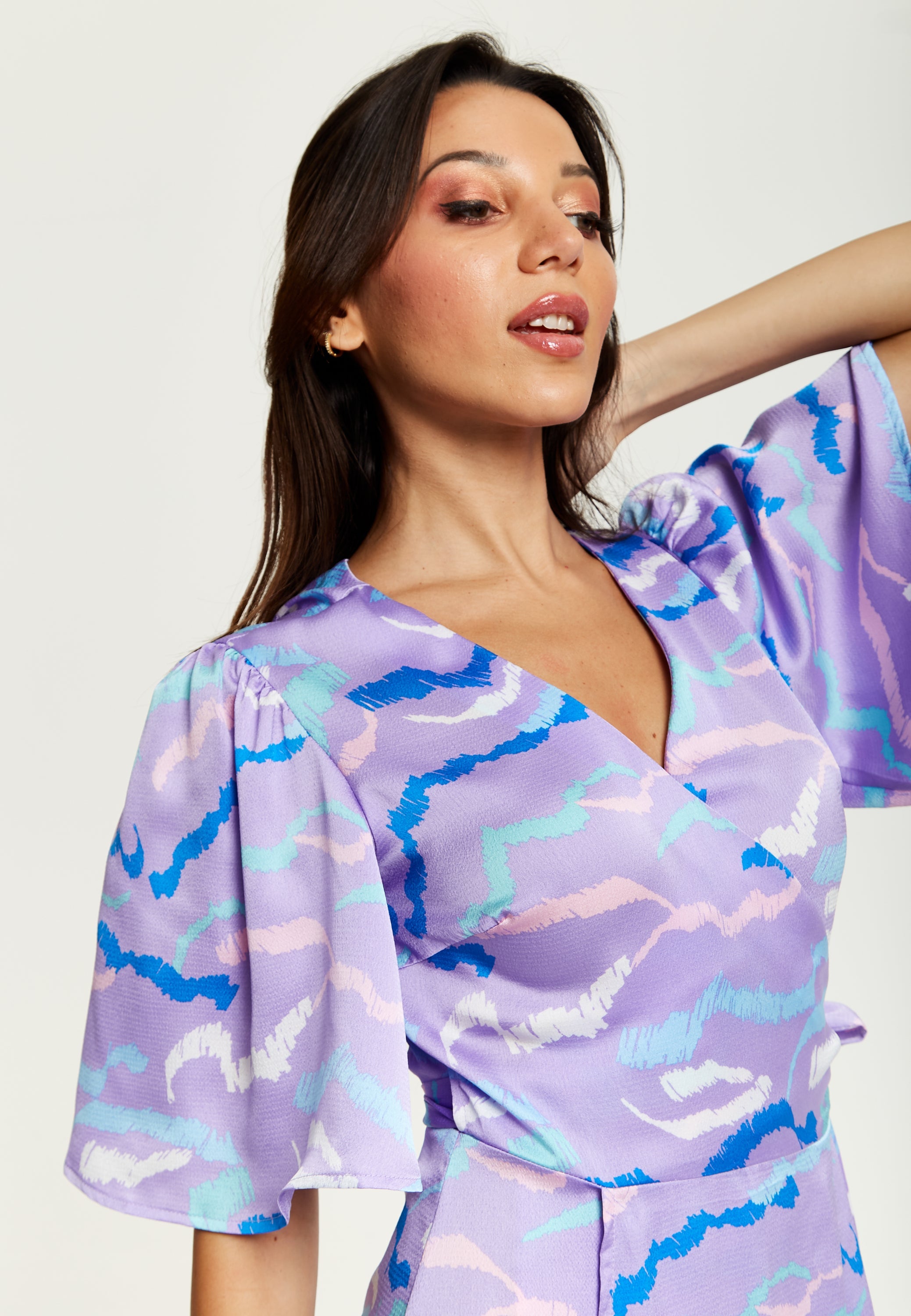 Step into the spotlight with the stunning Liquorish Mini Abstract Zebra Print Wrap Dress in a charming lilac shade. This dress seamlessly combines playful design with sophisticated elegance, making it a must-have for any fashion-forward individual.