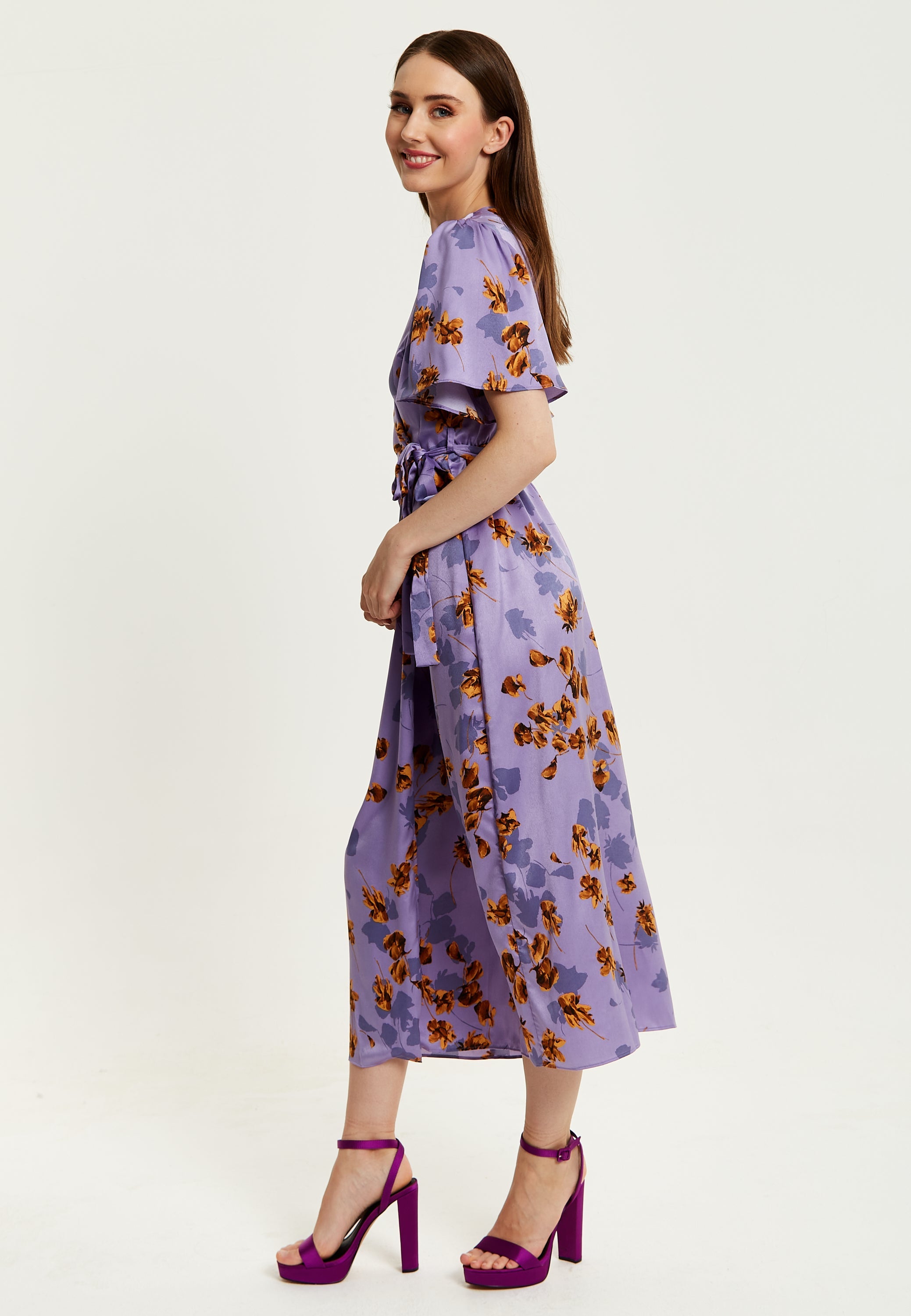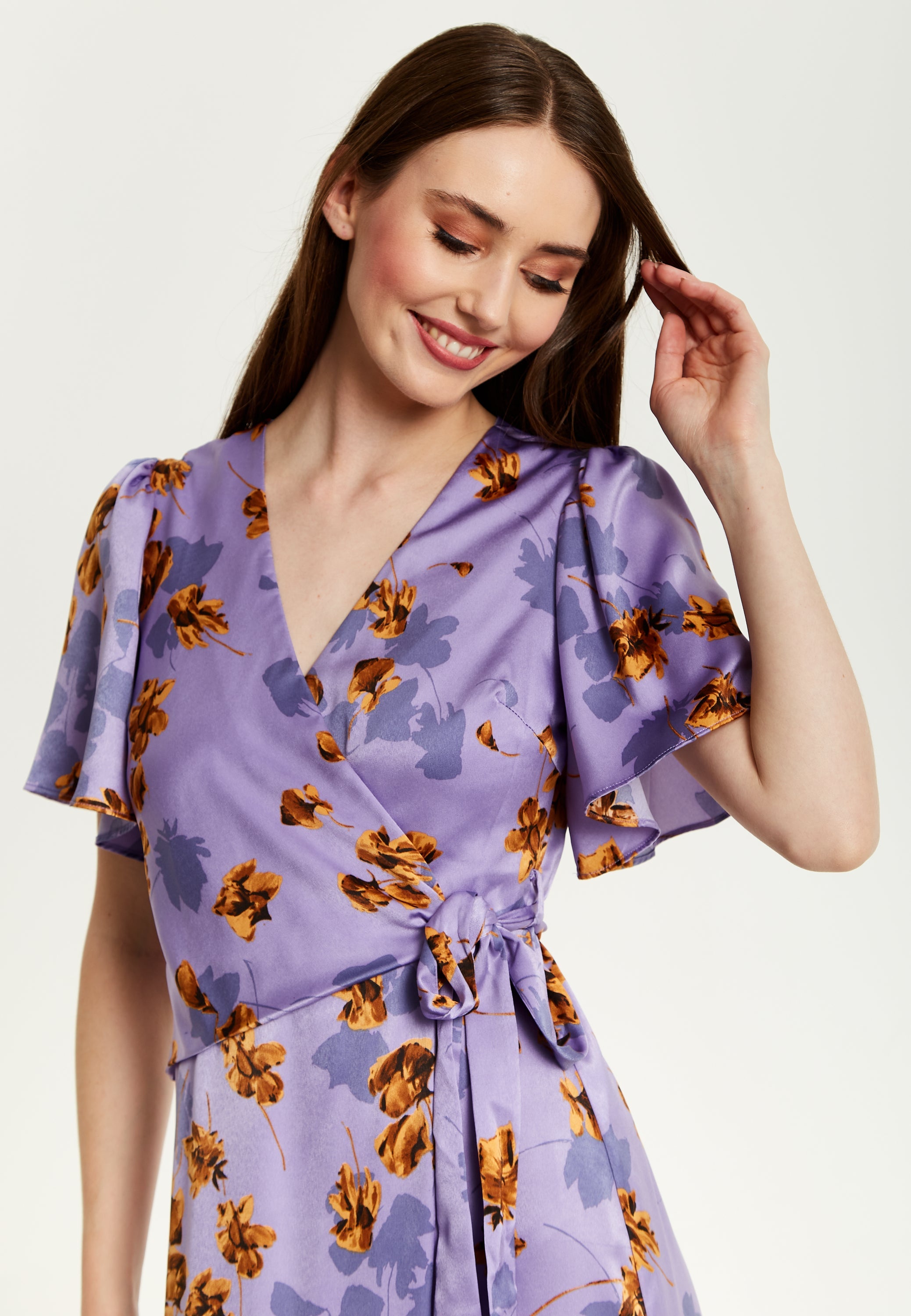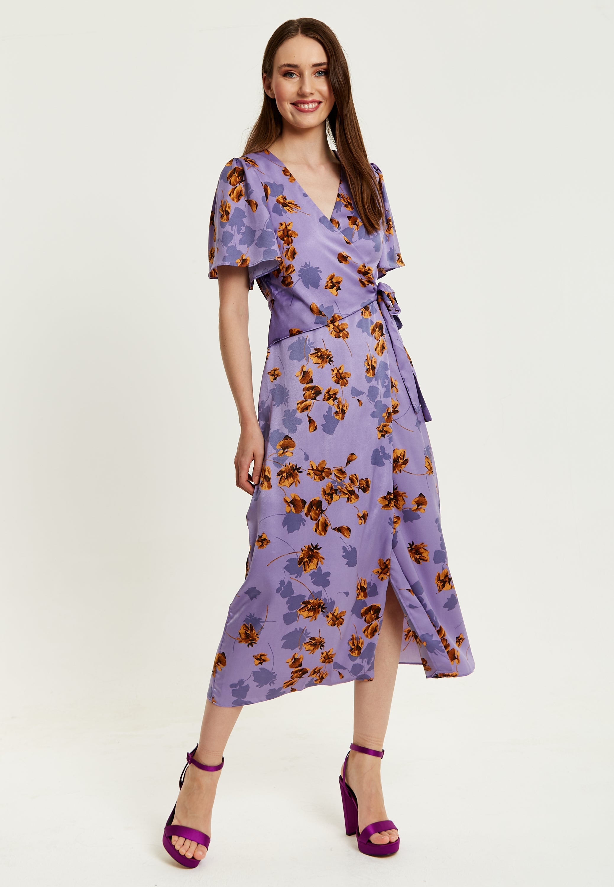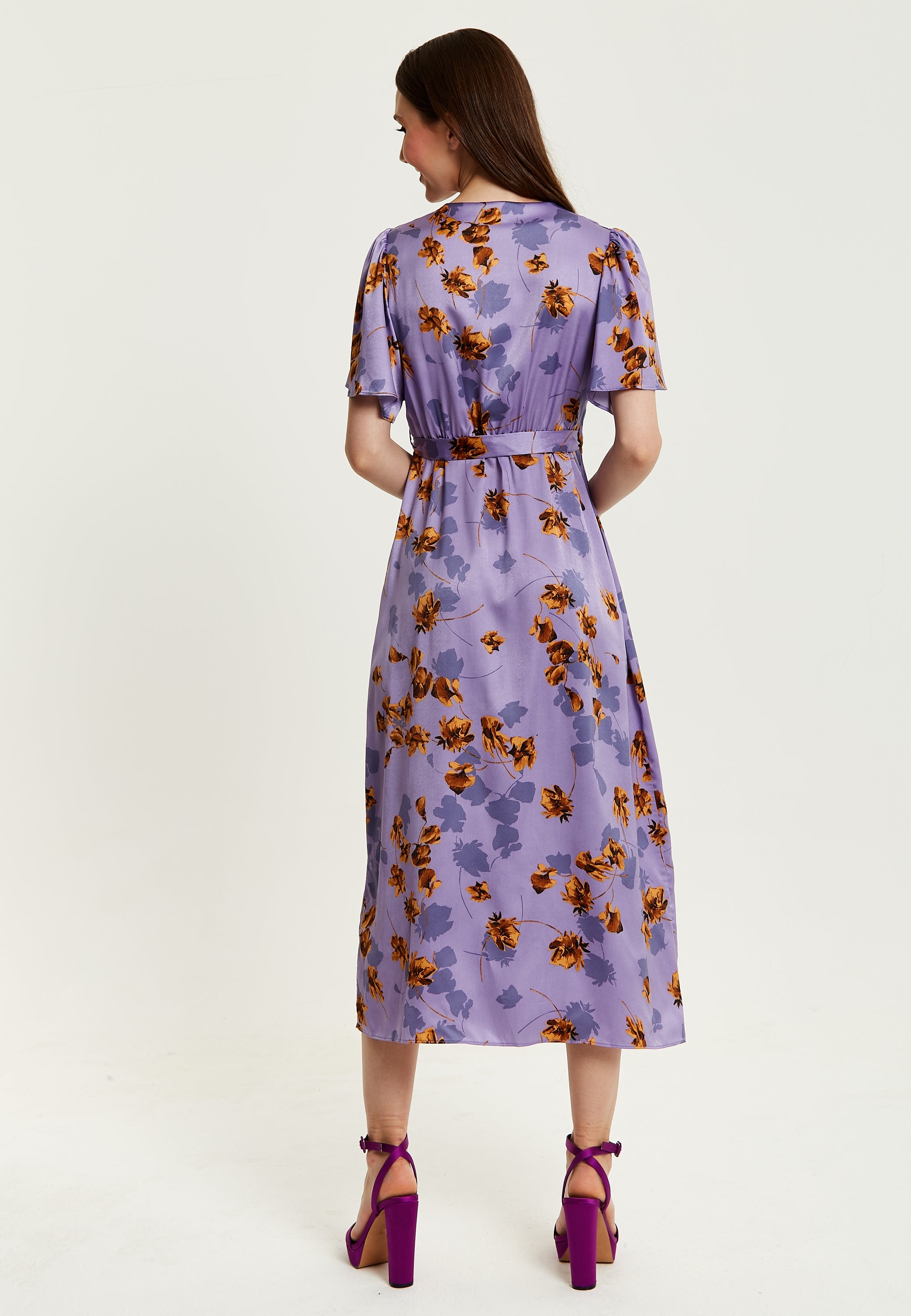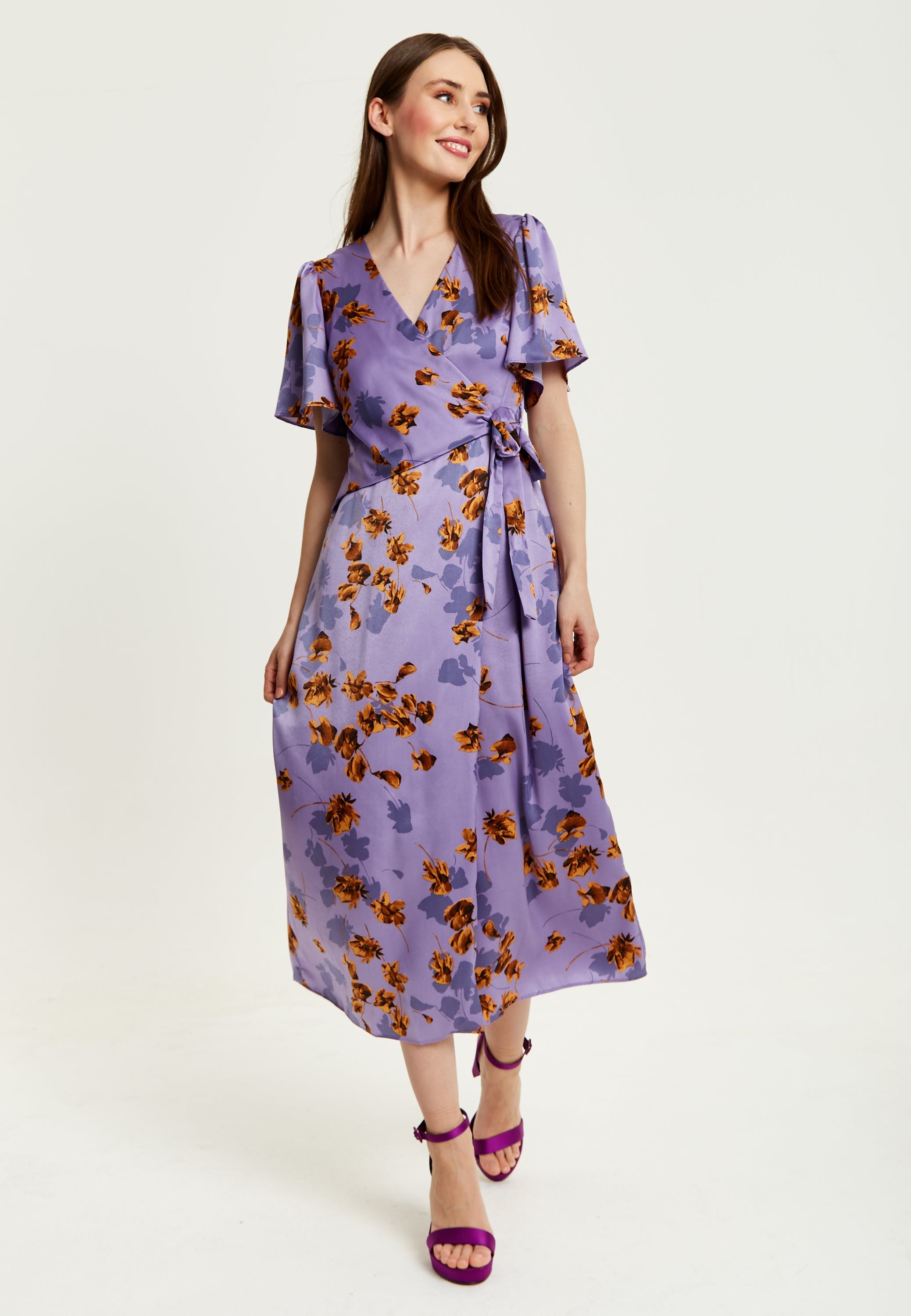 Women's Maxi Dress in Purple Floral with V Neck, Short Sleeves, Wrap Style, Midi Length - Liquorish