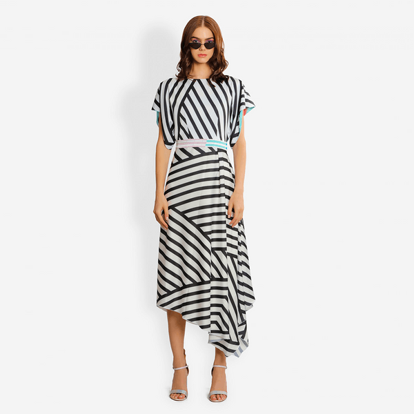 Keep it Casual, as beautiful as you. Perfect for all seasons !!! Simple yet classy a perfect pick from your wardrobe be it party or a corporate meeting. Striped Asymmetric dress.
