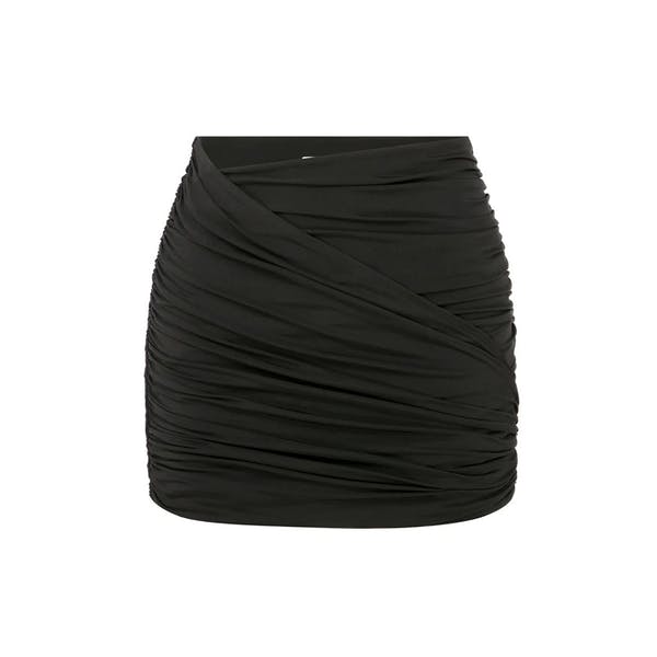 This Micha Mini Skirt is designed with a draped jersey fabric, and an asymmetric waistline for a unique flattering look. This skirt is the perfect addition to your wardrobe for a touch of sophistication. The black color adds a hint of elegance.