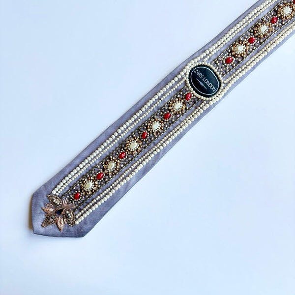The tie's design is a testament to meticulous workmanship. With its unique hand-embroidered beaded pattern, it adds a touch of elegance to any ensemble.
