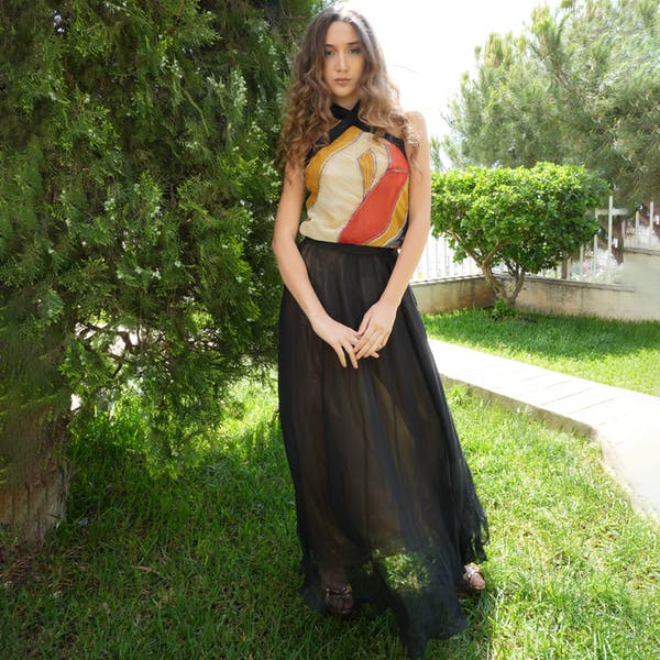 Patchwork Chiffon top with black and gold skirt.