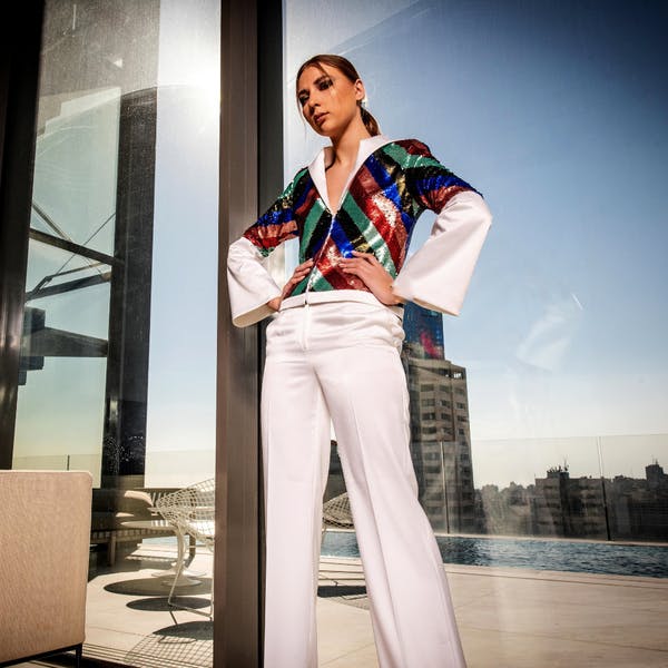 White crepe Blazer in multi-colored sequins and white straight pants.