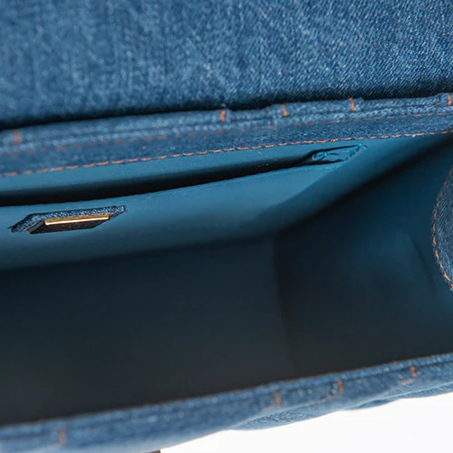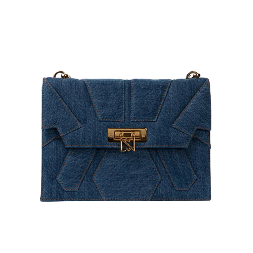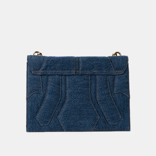 Shoulder bag 45% recycled cotton denim, 40% recycled plastic fabric, 5% gold plated brass, 10% resin chain.
