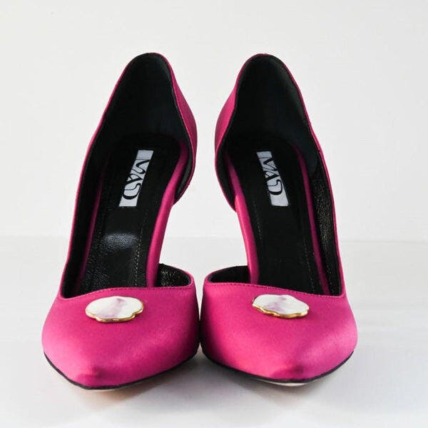 The simple, side cut-out high-heel fuchsia satin pump with a high-quality leather interior.